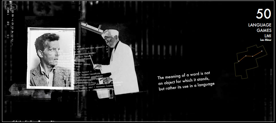 88 Constellations for Wittgenstein (to be played with the Left Hand) is an interactive, non-linear net.art piece that explores the life and philosophy of Ludwig Wittgenstein through a series of animated vignettes created in Flash. Each of the 88 sections corresponds to one of the 88 constellations in the night sky. The constellations become a way for the viewer to negotiate the associative relationships between these vignettes. As well, viewers can interact with each collage animation using their left hand to trigger events from the computer keyboard (in homage to Ludwig Wittgenstein’s brother Paul – a concert pianist who lost his right arm in WWI but continued his career performing piano works composed for the Left Hand). This work considers questions that Ludwig Wittgenstein pondered in his career as a philosopher: logic, language, the nature of thinking, and the limits of knowledge – all in relation to our contemporary digital world.