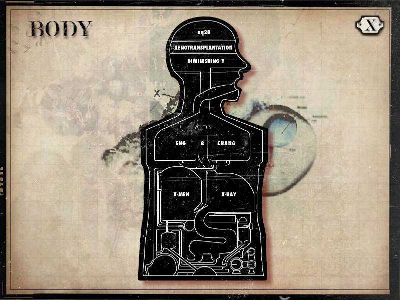 This work examines how the letter X became part of Western languages and how it has been used as a cipher for otherness and the unknown. As a survey of meanings and histories, it looks at how the letter X has influenced the realms of law, psychoanalysis, medicine, technology, geography, and linguistics. The letter X is one of the most simple of graphic gestures and yet it has a complex history and mysterious presence in our language. The letter X censors, alludes to, stands in for, is a substitute for. This piece allows the viewer to browse through the associations and dense theoretical ideas that have become attached to this letter. The piece consists of many interactive animated collages with voiceovers and music creating a rich and strange interactive experience for the viewer.